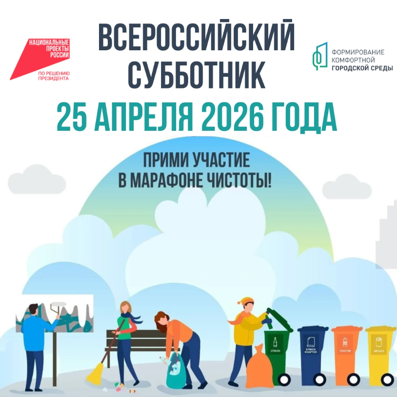 Уважаемые жители! Присоединяйтесь ко Всероссийскому субботнику, который состоится 25 апреля. Субботник пройдет в 88 городах России. Приглашаем вас выйти во дворы и вместе с работниками управляющей компании и ЖЭУ привести в порядок свои придомовые территории. Инвентарь можно взять в эксплуатационном участке.